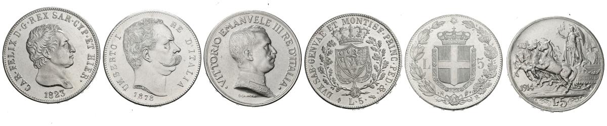 MONEDAS EXTRANJERAS. Lote compuesto por 3 replicas de 5 Liras de Italia de diferentes años. A EXAMINAR.