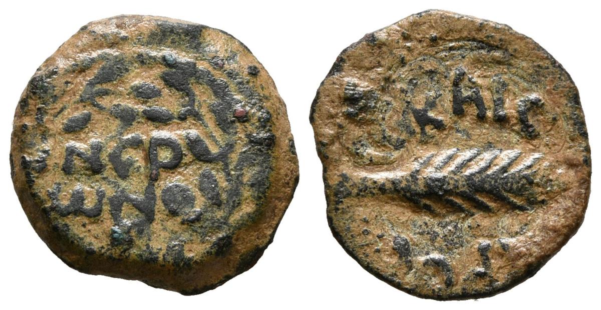 JUDAEA, Porcius Festus (acuñada en nombre de Nerón). Prutah. (Ae. 2,94g/16mm). 58-59 d.C. Jerusalén. (Meshorer TJC 345; RPC 4972). MBC.