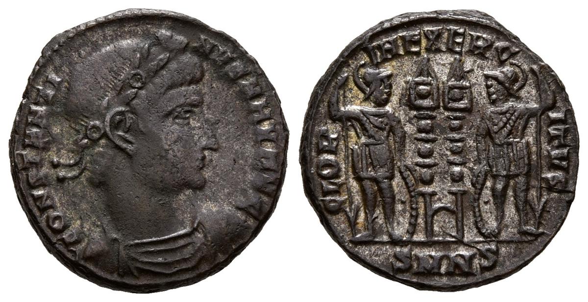 CONSTANTINO I. Follis. (Ae. 2,85g/17mm). 306-307 d.C. Nicomedia. (RIC 188). MBC+/EBC-. Restos de plateado original en reverso.