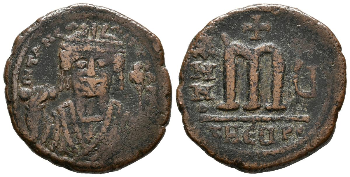 MAURICIO TIBERIO. Follis. (Ae. 11,54g/23mm). 589-590 d.C. (Año 8). Theoupolis (Antioquía). (Sear 532). MBC-.