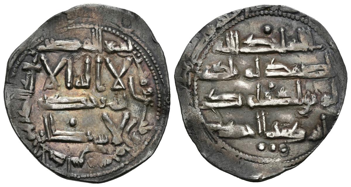 EMIRATO INDEPENDIENTE. Muhammad I. Dirham. 238 H. Al-Andalus. Vives 150; Miles 130 b-f. Ar. 2,31g. Preciosa pátina irisada. Algo recortada. MBC.