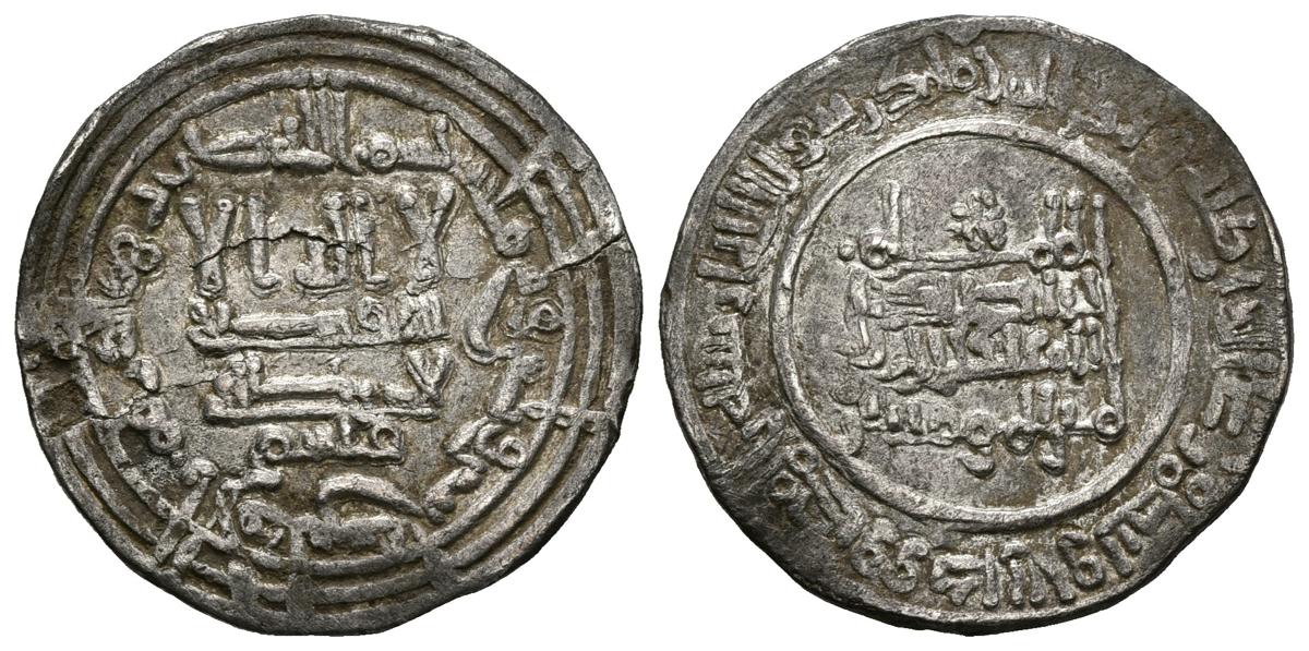 CALIFATO DE CORDOBA. Abd al-Rahman III al-Nasir. Dirham (Ar. 3,63g/22mm). 332H. Al-Andalus. (Vives 398). Citando a Qasim en IA. MBC+. Grieta.