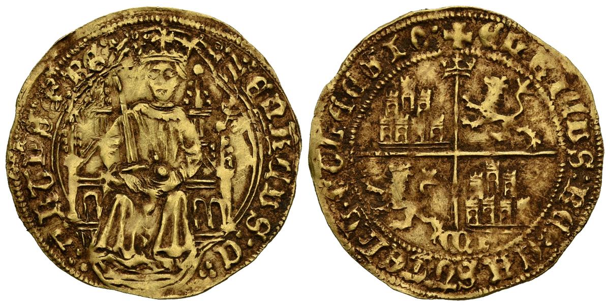 En el imponente anverso aparece el rey de frente sentado en un trono de respaldo alto. Viste un manto sencillo con bordados en el cuello, y ciñe su cabeza con corona que deja ver la cabellera algo rizada. Con la mano derecha porta la espada, mientras con la izquierda soporta el globus. En el reverso el tradicional cuartelado de castillos y leones rampantes – y coronados – referencian el reino, además de incluir asimismo la marca de la ceca correspondiente al pie o encima del eje vertical.