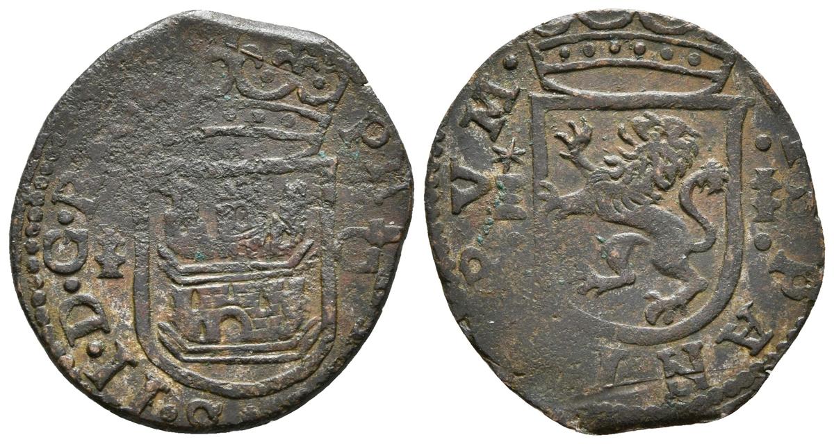 FELIPE II. Cuartillo. S/D. Cuenca, Armiño y C, Cuenco superado de estrella y armiño. Cal-808. Ae. 1,87g. MBC-/MBC.