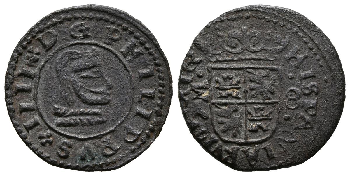 FELIPE IV (1621-1665). 8 Maravedís. (Ae. 2,08g/20mm). 1662. Madrid M. Falsa de época. (J.S. pág 429 var). Variante: Fecha 162 en lugar de 1662, M horizontal e Y invertida. MBC+.