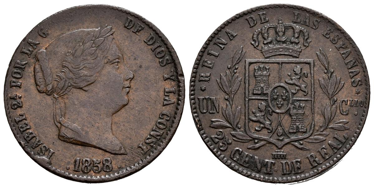 ISABEL II (1833-1868). 25 Céntimos de Real (Ae. 9,02g/27mm). 1858. Segovia. (Cal-2019-191). MBC+. Preciosa pátina.