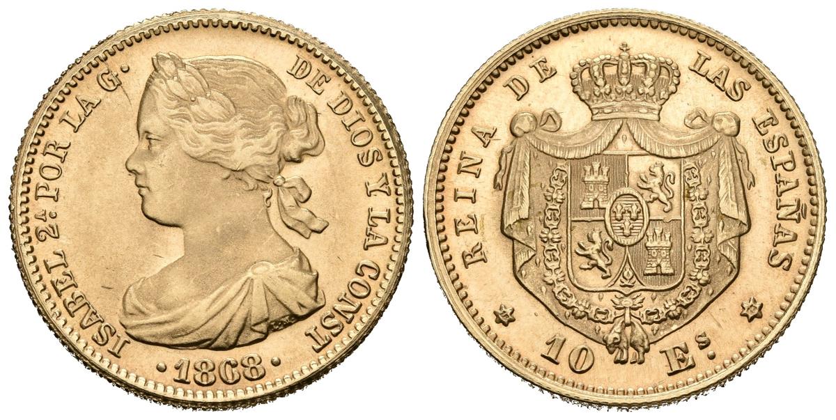 ISABEL II (1834-1868). 10 Escudos. 1868. *18-73. (Au. 7,94/22mm). Cal- 41. Reproducción de joyería. EBC+.