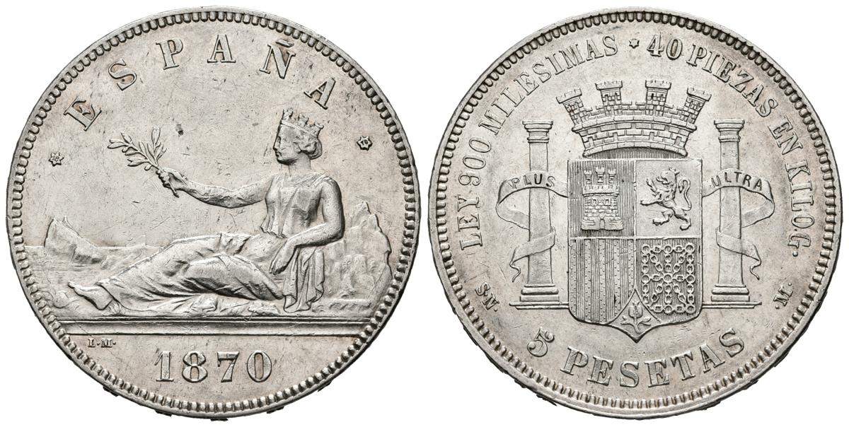GOBIERNO PROVISIONAL (1868-1871). 5 Pesetas. (Ar. 24,94g/37mm). 1870 *18-70. Madrid SNM. (Cal-2019-39). EBC-. Marquitas. Escasa así.