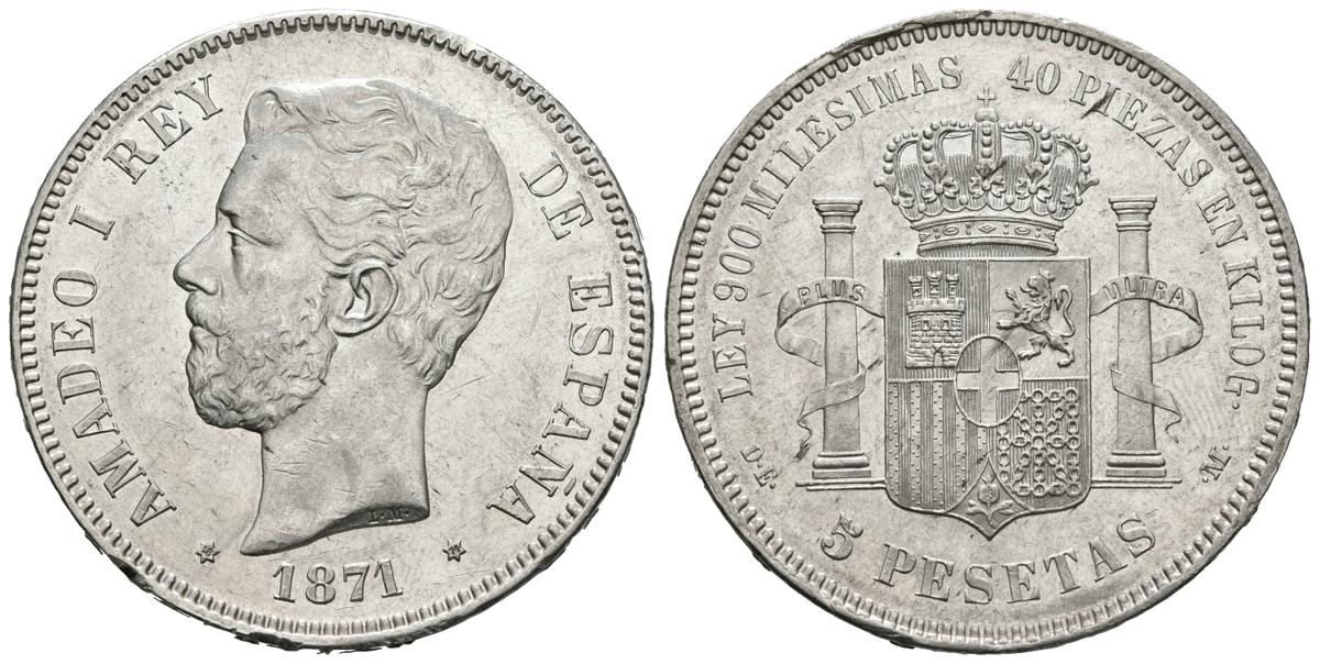 AMADEO I (1871-1873). 5 Pesetas. (Ar. 24,89g/37mm). 1871 *18-74. Madrid DEM. (Cal-2019-5). EBC+. Marquitas. Escasa así, magnífico ejemplar con brillo original.Tras una convulsa huida de la reina Isabel II y un gobierno provisional, al italiano Amadeo de Saboya, Amadeo I, le tocó gobernar uno de los momentos de mayor inestabilidad de la historia contemporánea española. El intento de implantar una monarquía parlamentaria sólo duró 3 años, los que van desde 1871 a 1873. Sin embargo, podemos encontrar monedas acuñadas a nombre de este monarca hasta 1875. La moneda que presentamos está acuñada en 1874, es decir en plena I República. De hecho la vida de estas monedas perdurará mucho más allá en el tiempo, teniéndose constancia de su circulación hasta bien entrado el siglo XX. Sin duda, la gran cantidad de piezas que se emitieron, más de veinticuatro millones de duros, influyó en su larga y extensa vida.Amadeo sólo acuñó, para su circulación, monedas de 5 pesetas ya que aunque existieron piezas de 25 y 100 pesetas, éstas, son consideradas pruebas, o al menos no fueron acuñadas para circular. Tras muchos años, y con la salvedad del periodo de José Napoleón a principios del XIX, el escudo del país sufre en su reverso una importante modificación, dejando las tres flores de lis, símbolo de los Borbones, su lugar central a una cruz, símbolo de la Casa de Saboya.