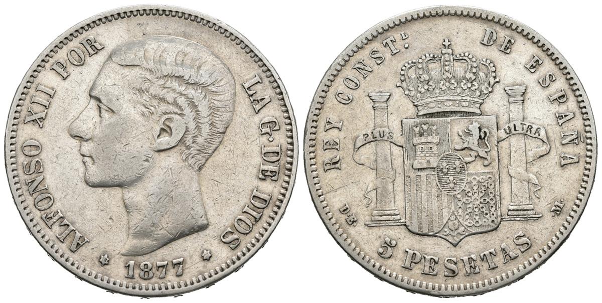 ALFONSO XII (1874-1885). 5 Pesetas. (Ar. 24,80g/37mm). 1877 *18-77. Madrid DEM. (Cal-2019-38). MBC.