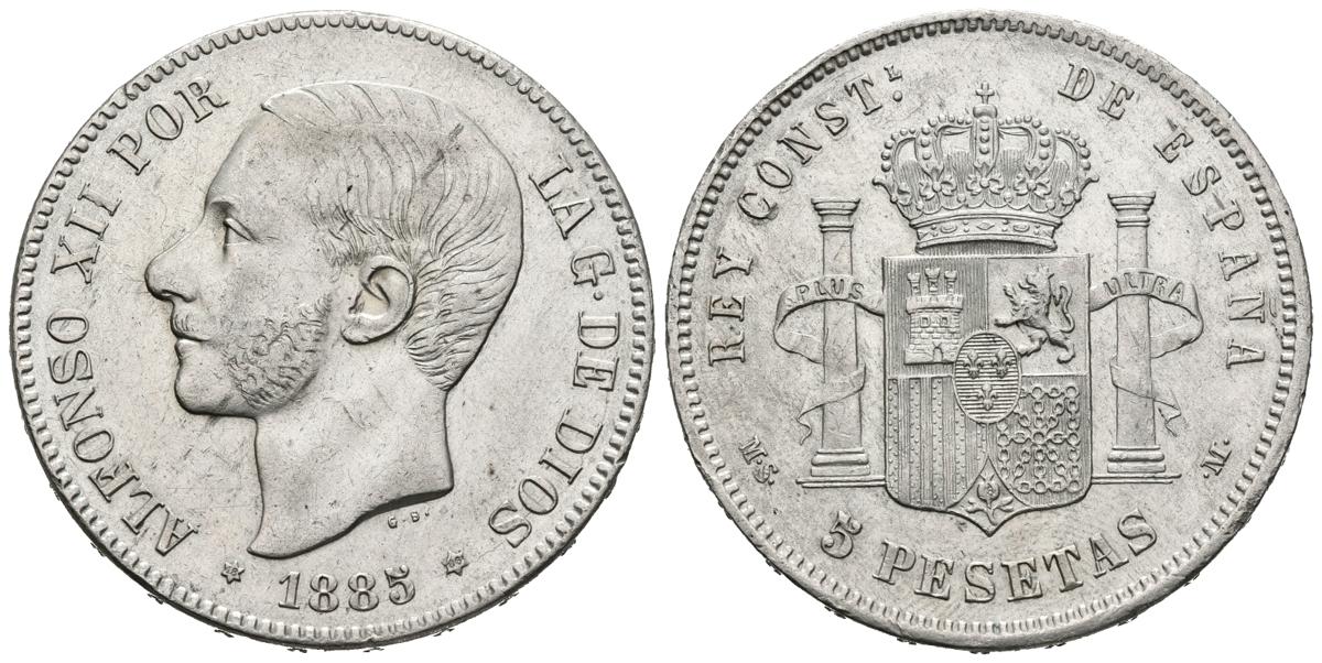 ALFONSO XII (1874-1885). 5 Pesetas. (Ar. 24,97g/37mm). 1885 *18-86. Madrid MSM. (Cal-2019-61). MBC+.