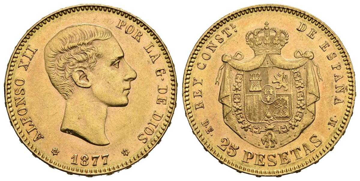 ALFONSO XII (1874-1885). 25 Pesetas. (Au. 8,07g/24mm). 1877 *18-77. Madrid DEM. (Cal-2019-68). EBC.