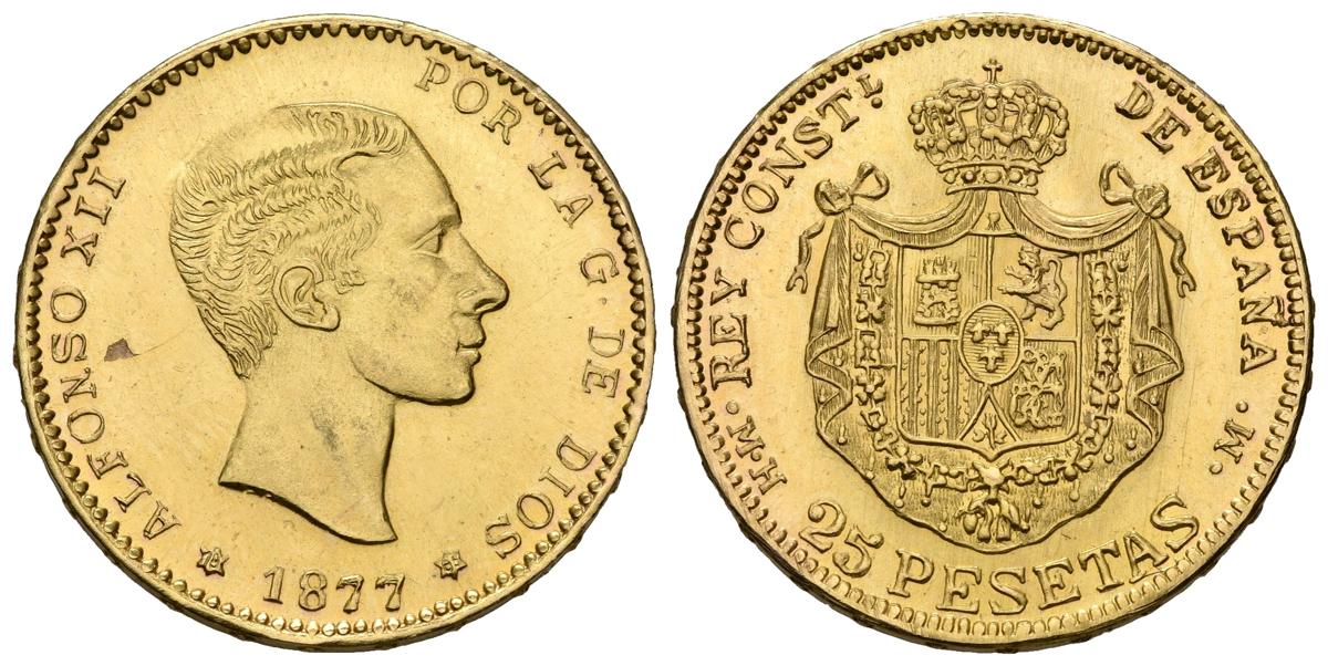 ALFONSO XII (1874-1885). 25 Pesetas (Au. 7,82g/24mm). 1877 (*18*85?). Madrid. (Cal-2019-68). EBC+ Reproducción de joyería. Fechas en estrellas imposibles.