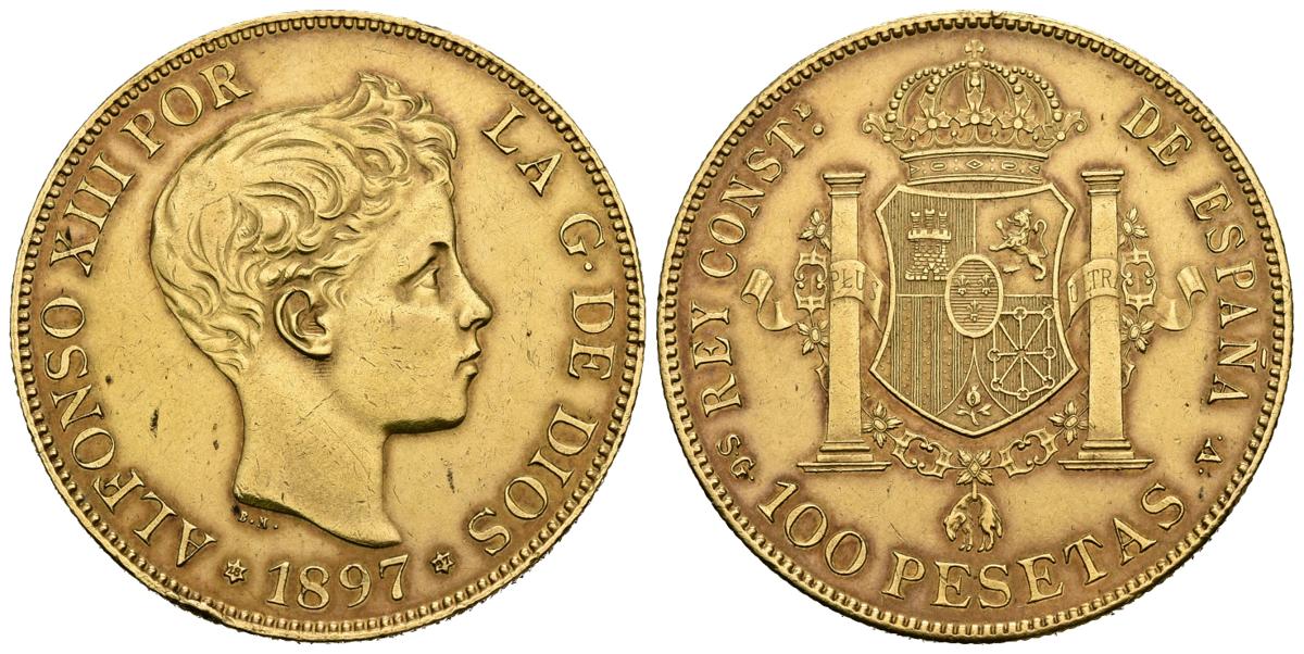 ALFONSO XIII (1885-1931). 100 Pesetas. (Au. 32,26g/35mm). 1897 *18-97. Madrid SGV. (Cal-2019-119 var). Variante: Oreja rayada. EBC+. Golpecito en canto. Precioso tono.