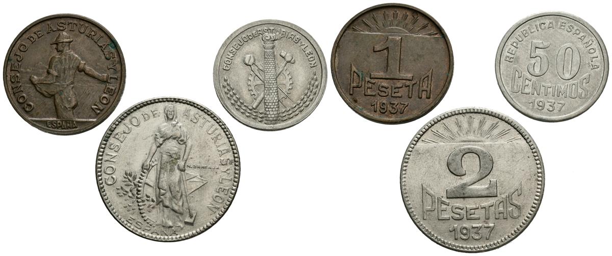 CONSEJO DE ASTURIAS Y LEON. Conjunto de tres valores acuñados por este Consejo: 50 Céntimos, 1 y 2 Pesetas. 1937. (Cal-2019-8/10). EBC-.