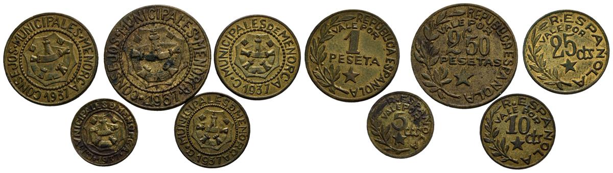 MENORCA. Serie completa con todos los valores: 5, 10 y 25 Céntimos y 1 y 2,50 Pesetas. 1937. (Cal-2019-20/24). MBC+/EBC-.