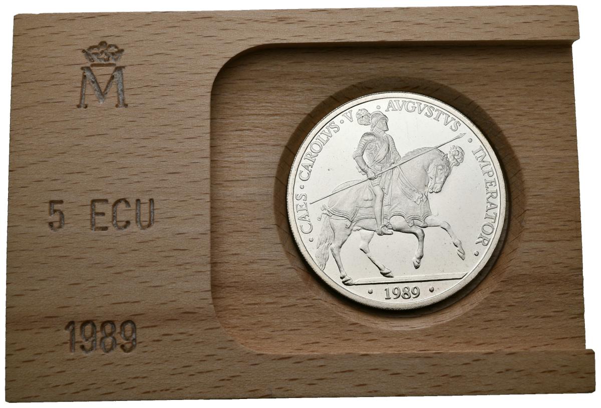 JUAN CARLOS I. 5 Ecu. (Ar. 33,62g/42mm). 1989. "CARLOS V". Presentada en estuche original con certificado. PROOF.