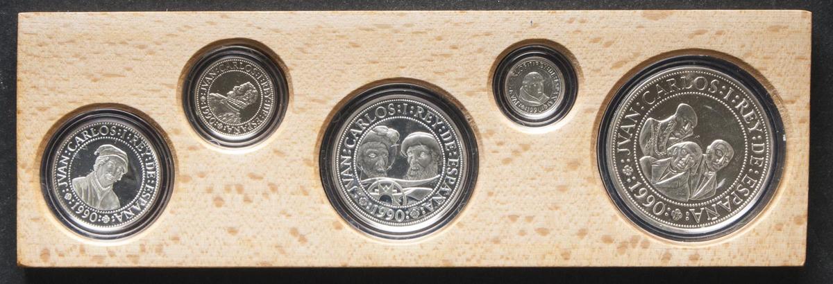 JUAN CARLOS I. Set de 5 monedas conmemorativa de los valores: 2000, 1000, 500, 200 y 100 Pesetas. 1990. "Descubrimiento de América". PROOF. Incluye estuche oficial y certificado.
