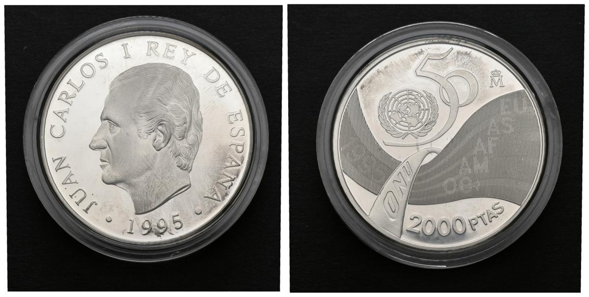 JUAN CARLOS I. 2000 Pesetas. (Ar. 27,00g/40mm). 1995. "50 ANIVERSARIO DE LA ONU". PROOF. Presentada en estuche oficial con certificado.