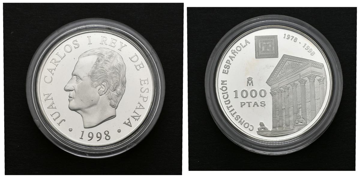 JUAN CARLOS I. 1000 Pesetas. (Ar. 13,50g/33mm). 1998. "XX ANIVERSARIO DE LA CONSTITUCION ESPAÑOLA". PROOF. Presentada en estuche oficial con certificado.