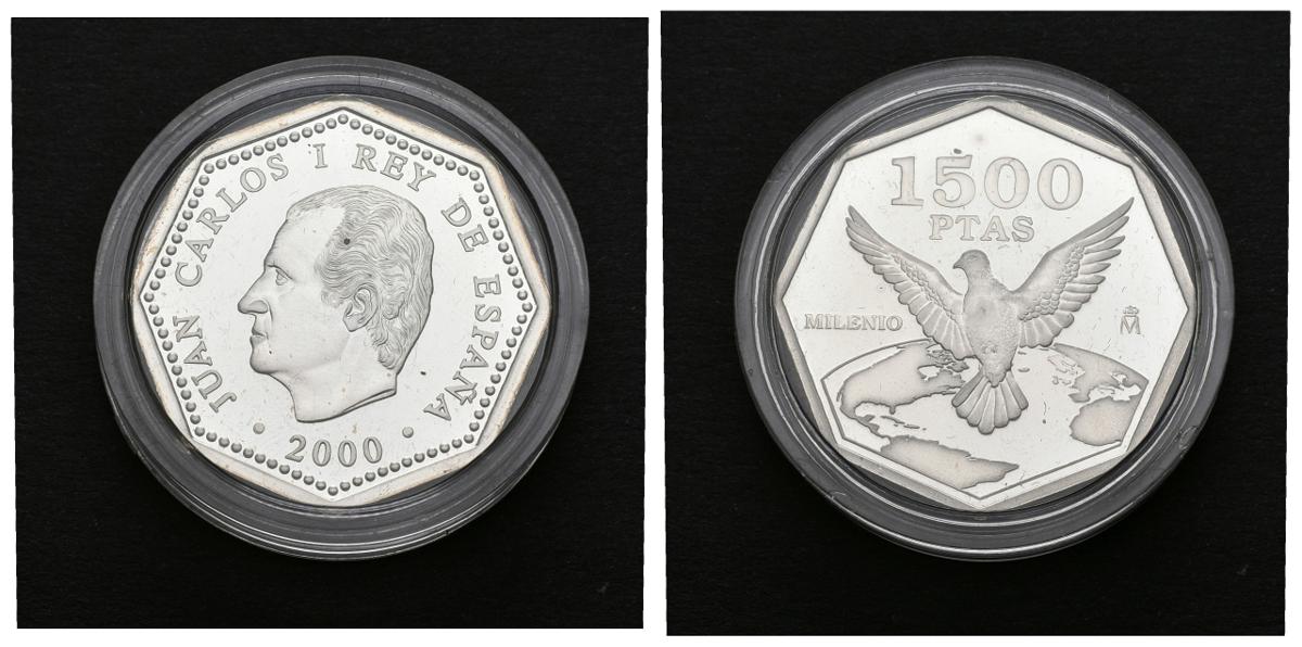 JUAN CARLOS I. 1500 Pesetas. (Ar. 20,00g/31mm). 2000. "MILENIO PAZ". Presentada en estuche oficial con certificado. PROOF.