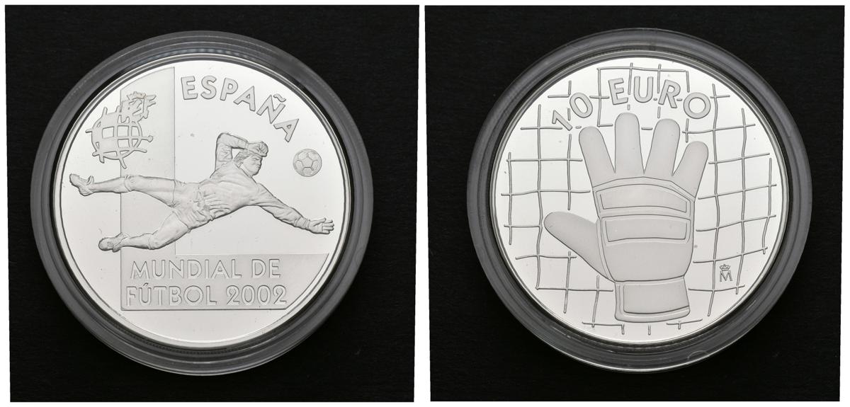 JUAN CARLOS I. 10 Euros. (Ar. 27,00/40mm). 2002. "MUNDIAL DE FUTBOL 2002, GUANTE". Presentada en estuche oficial con certificado. PROOF.
