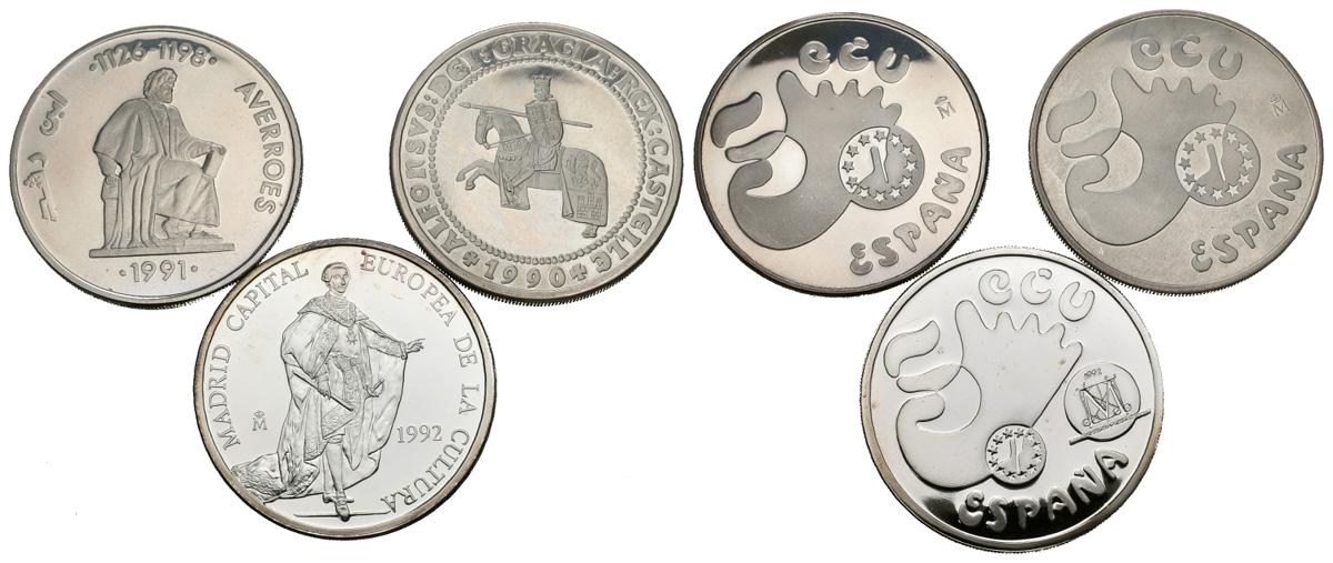 JUAN CARLOS I. Conjunto de 3 monedas de 5 Ecu de los años 1990, 1991 y 1992. Ar. PROOF. Presentadas en estuches oficiales y con certificados.