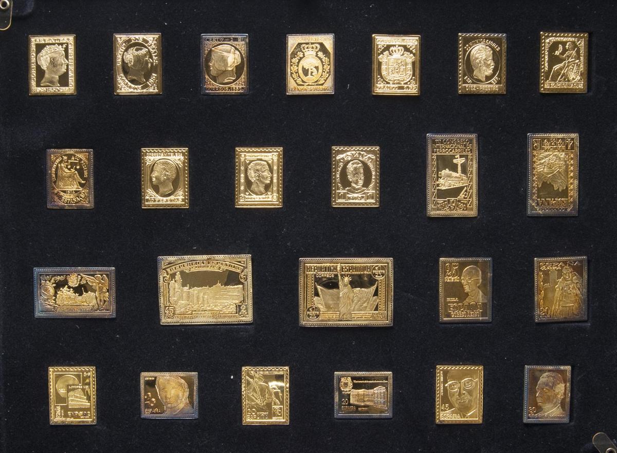 CONTEMPORANEO. Conjunto de 24 piezas en plata de 925 milésimas bañadas en oro del Primera Ley (plata "vermeil"). Emisión especial conmemorativa de los 150 años del sello en España. (Peso total de plata: ). PROOF. Presentada en estuche de lujo y con certificado de autenticidad expedico por Correos y Telégrafos de España.