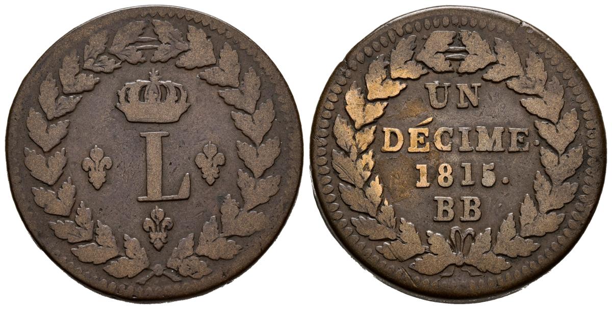 FRANCIA. 1 Décime. (Ae. 20,19g/32mm). 1815. Estrasburgo BB. (Km#701). BC+.