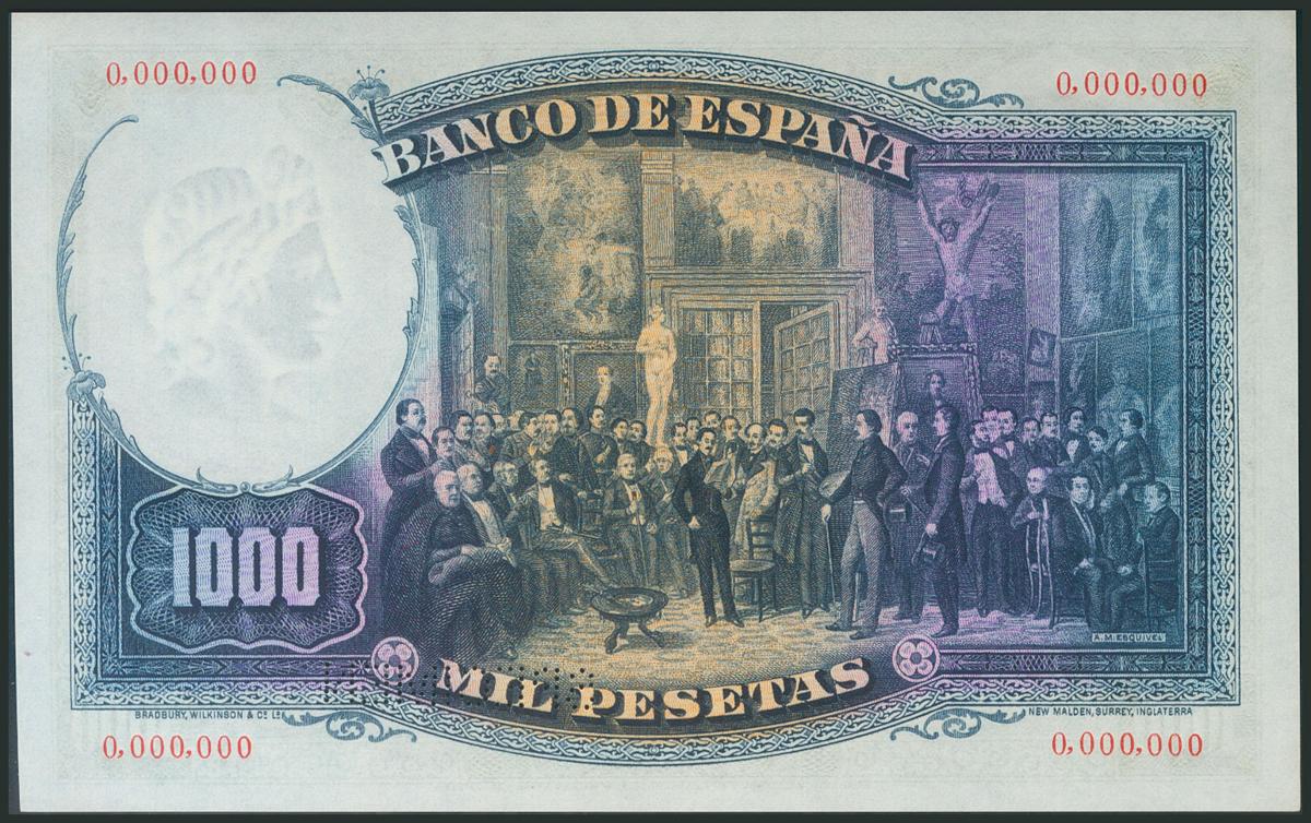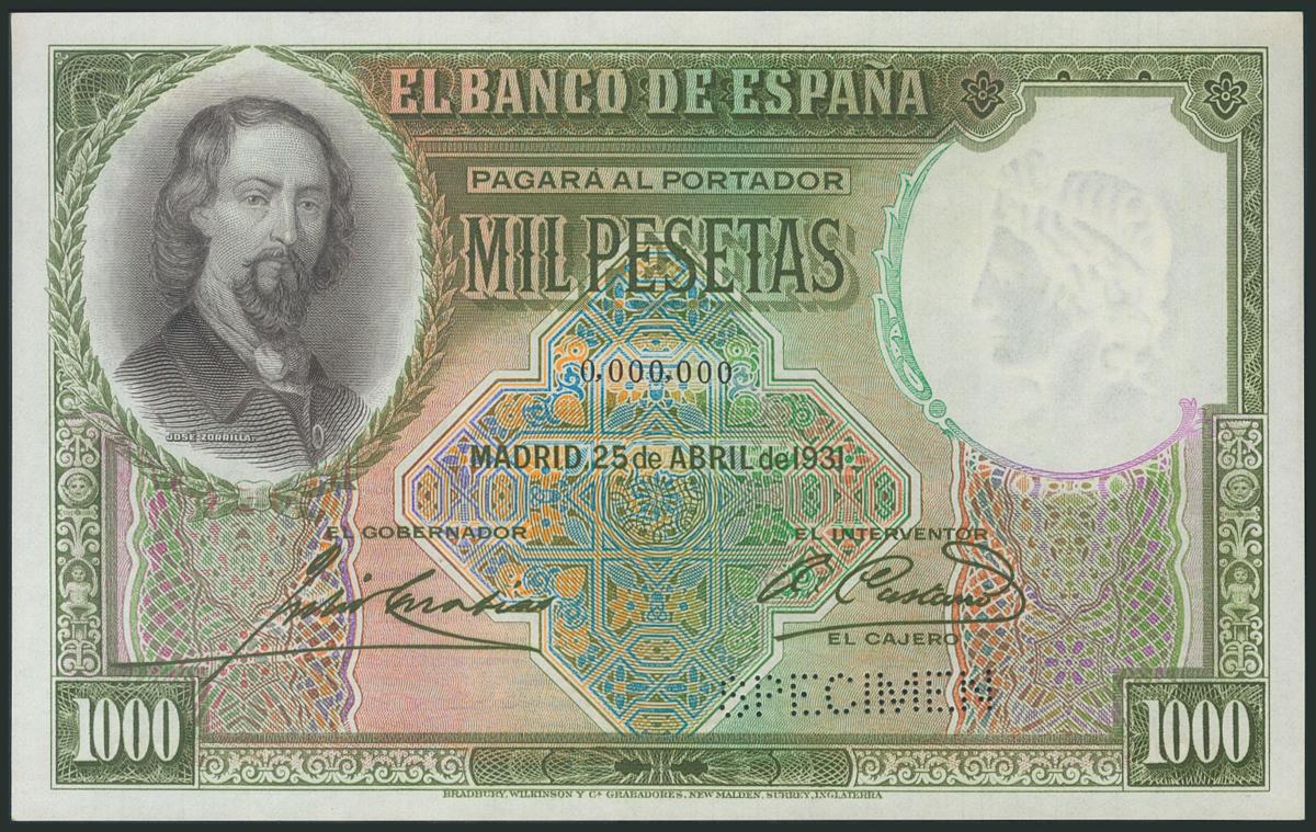 1000 Pesetas. 25 de Abril de 1931. SPECIMEN (taladrado). Sin serie y Nº0.000.000. (Edifil 2017: 362M). Apresto original. SC.