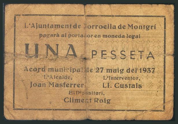 TORROELLA DE MONTGRI (GERONA). 1 Peseta. 27 de Mayo de 1937. (González: 10393). RC.