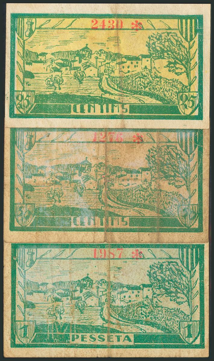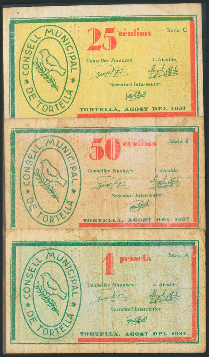 TORTELLA (GERONA). 25 Céntimos, 50 Céntimos y 1 Peseta. Agosto 1937. Series C, B y A, respectivamente. (González: 10405/07). MBC.