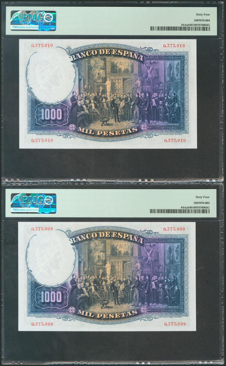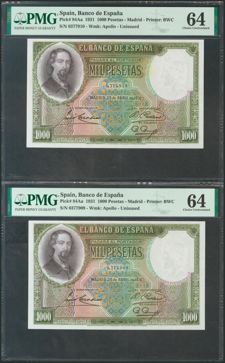 1000 Pesetas. 25 de Abril de 1931. Pareja correlativa. Sin serie. (Edifil 2017: 362). SC. Encapsulado PMG64, ambos.