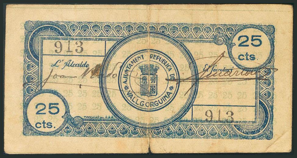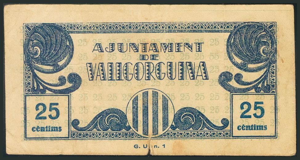 VALLGORGUINA (BARCELONA). 25 Céntimos. (1938ca). (González: 10527). Raro. MBC.