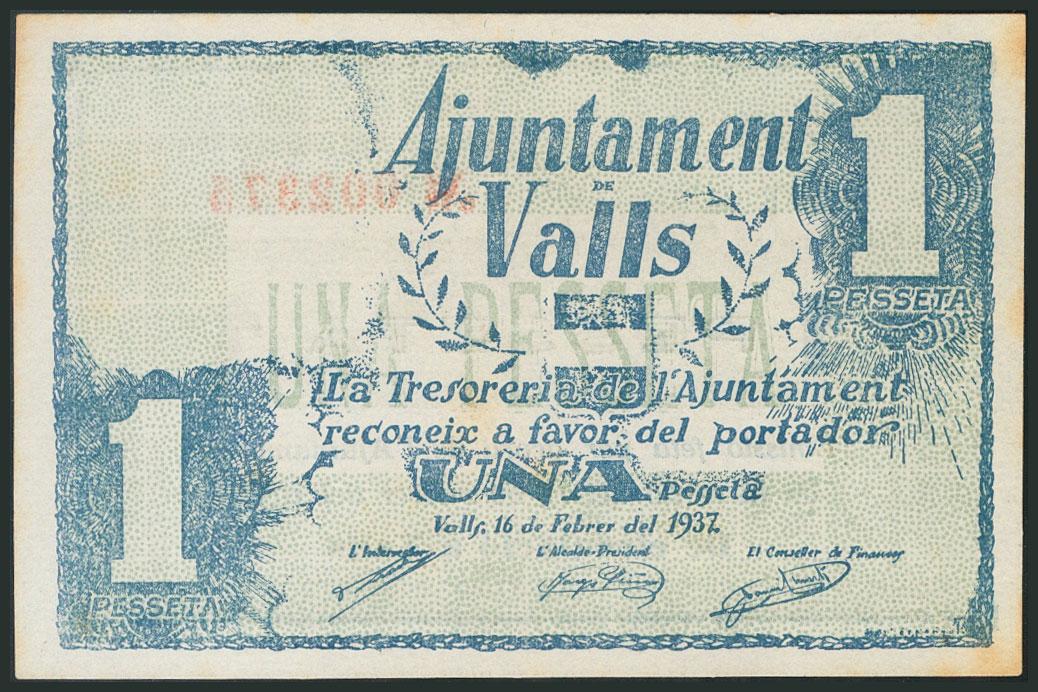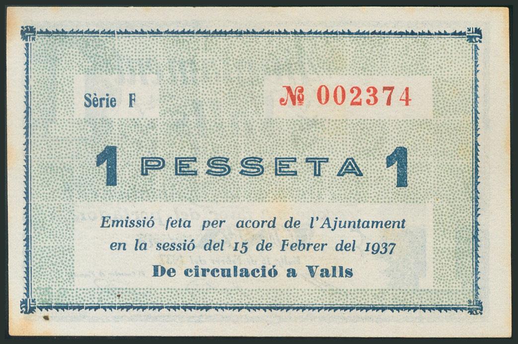 VALLS (TARRAGONA). 1 Peseta. 16 de Febrero de 1937. Serie F. (González: 10542). EBC.