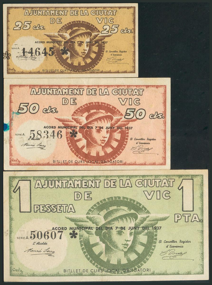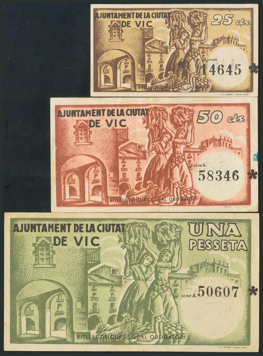 VIC (BARCELONA). 25 Céntimos, 50 Céntimos y 1 Peseta. 7 de Junio de 1937. Serie A, todos. (González: 10629/31). EBC/MBC.