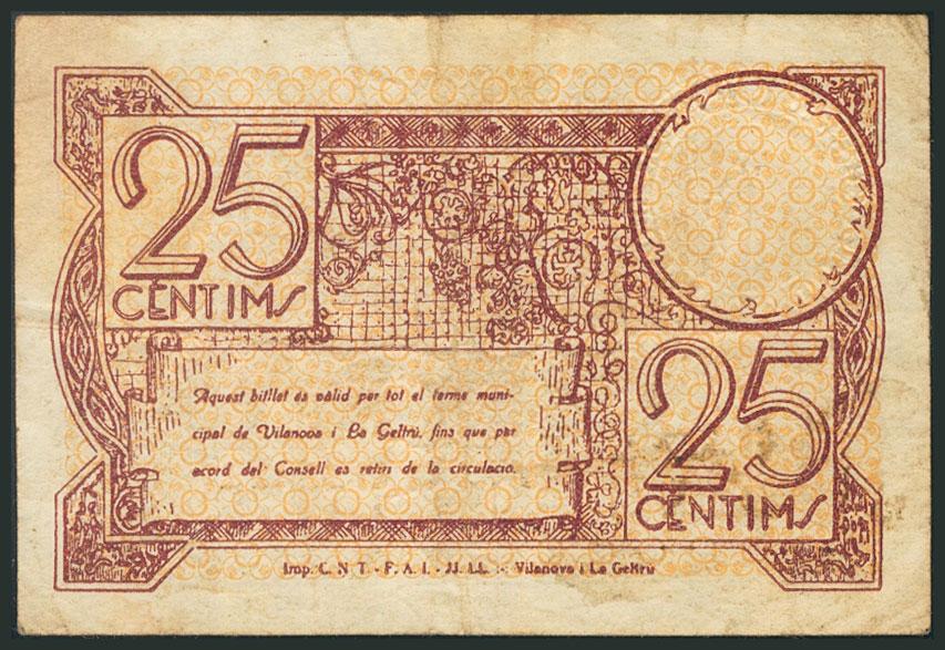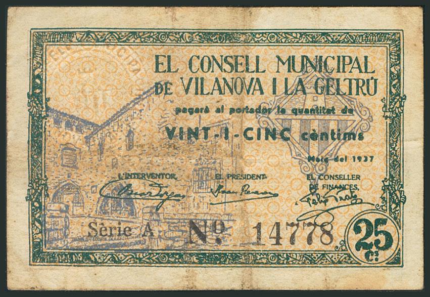 VILANOVA I LA GELTRU (BARCELONA). 25 Céntimos. Mayo 1937. Serie A. (González: 10832). BC.