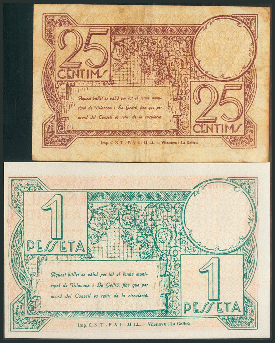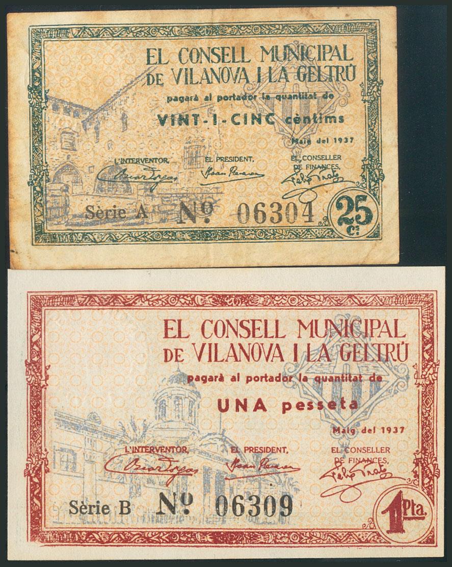 VILANOVA I LA GELTRU (BARCELONA). 25 Céntimos y 1 Peseta. Mayo 1937. Series A y B, respectivamente. (González: 10832/33). SC/EBC-.