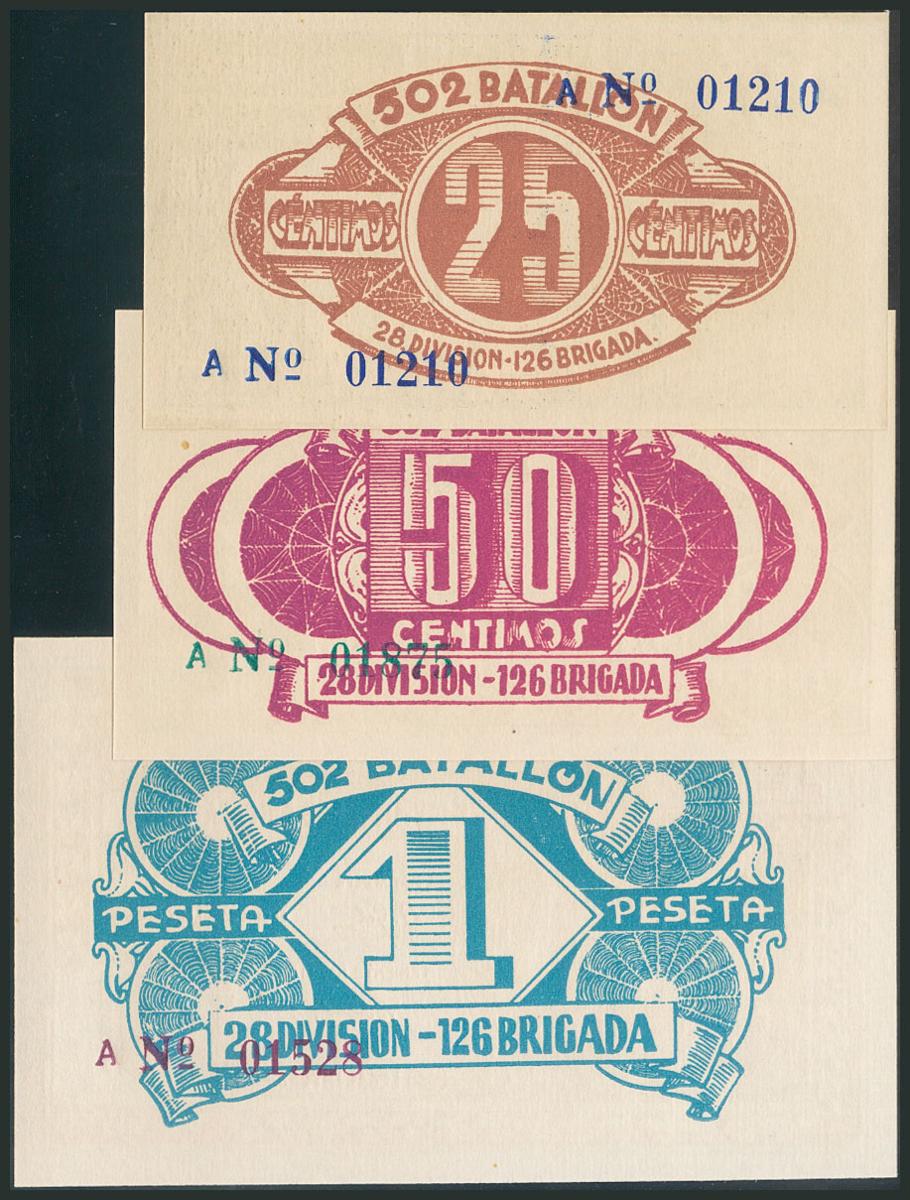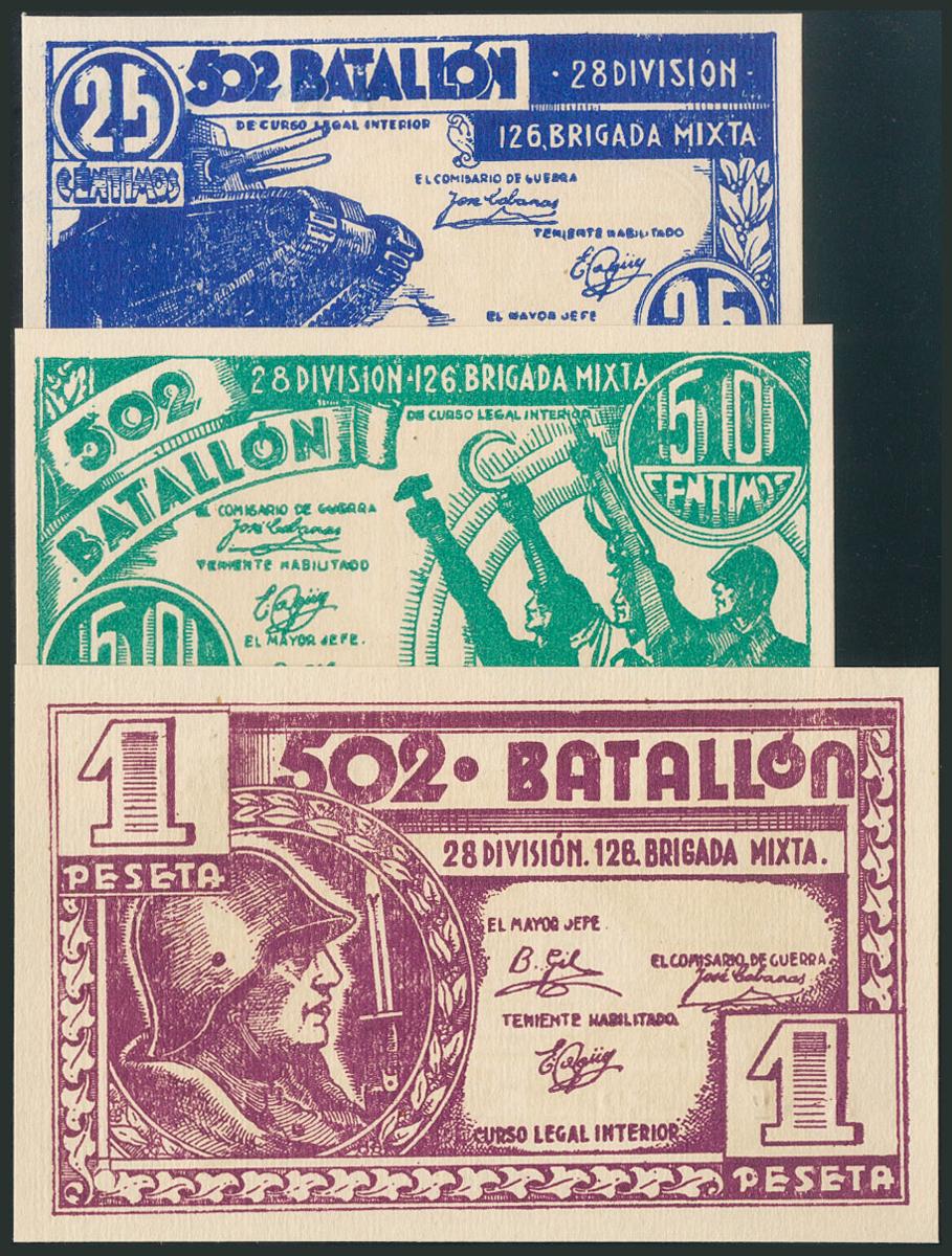 BILLETE MILITAR-502 BATALLON. Serie completa de la Brigada Mixta. 25 Céntimos, 50 Céntimos y 1 Peseta. (1937ca). Serie A. (González: 5876/78). Rara. SC.