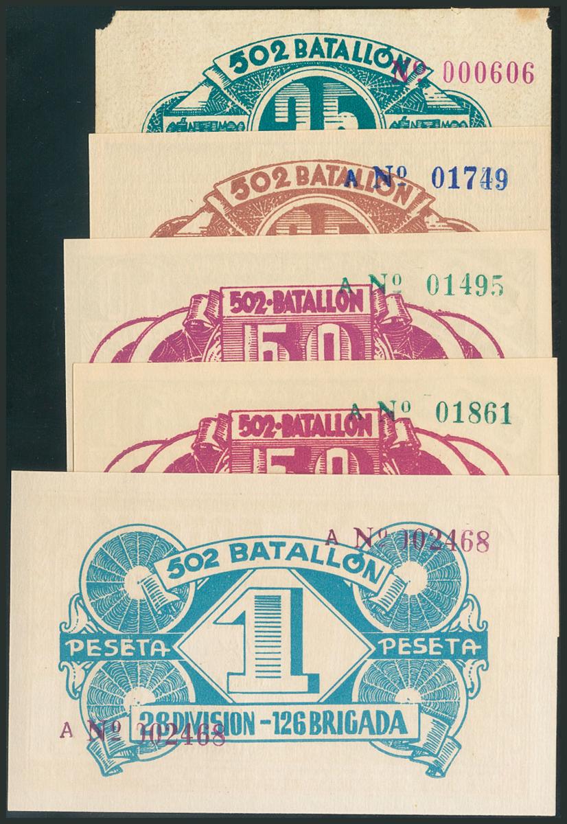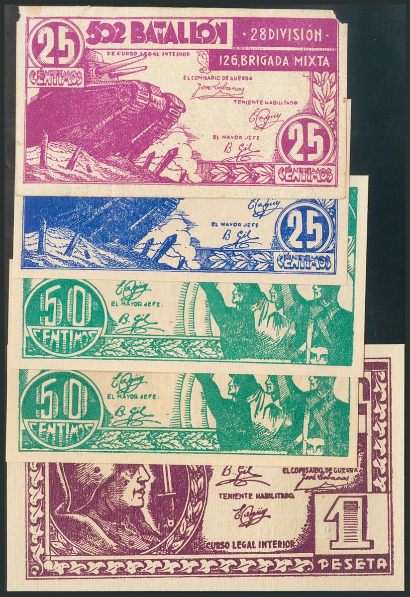 BILLETES MILITARES. 25 Céntimos (azul y lila), 50 Céntimos (2) y 1 peseta. 1937. Todos ellos serie A, excepto el 25 cts lila. (González: 5873, 5876, 5877(2), 5878). RC/SC.