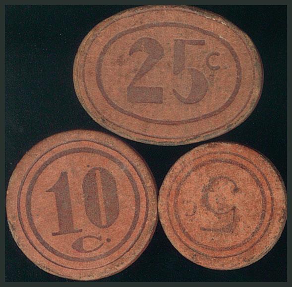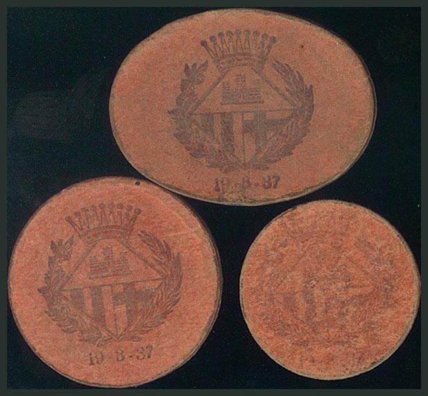 Conjunto de 3 monedas-cartón (5 cts, 10 cts y 25 cts), utilizadas en la época de la Guerra Civil con forma de moneda (no somos capaces de atribuir el lugar de utilización), agradecemos la colaboración del experto en billetes de la Guerra Civil, Don Fernando Hernández Martínez, que nos informa de la atribución de estas monedas-cartón, se tratan de Castellar del Vallés, en Barcelona. EBC.