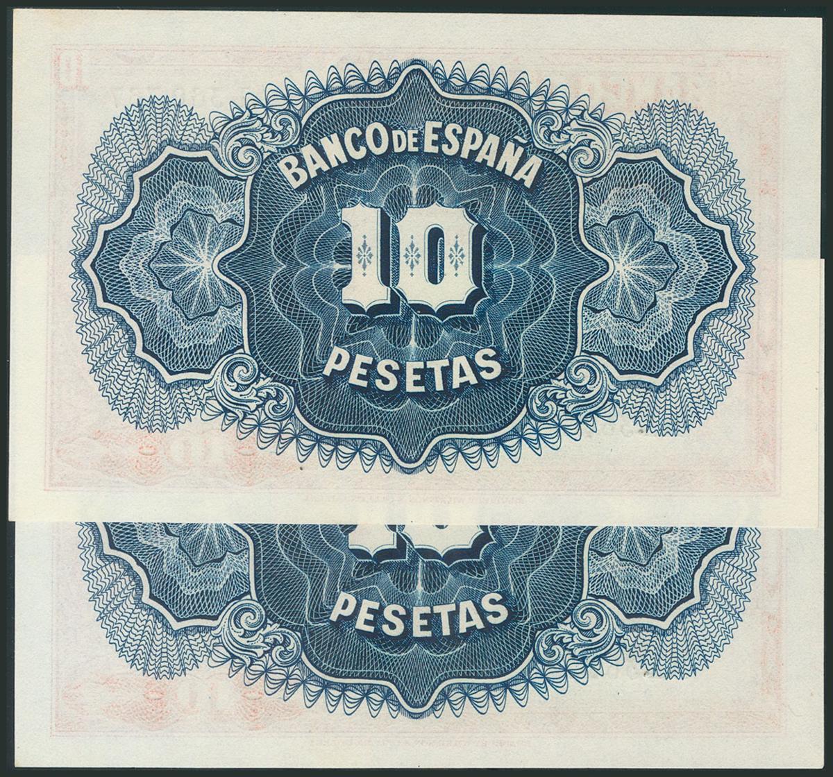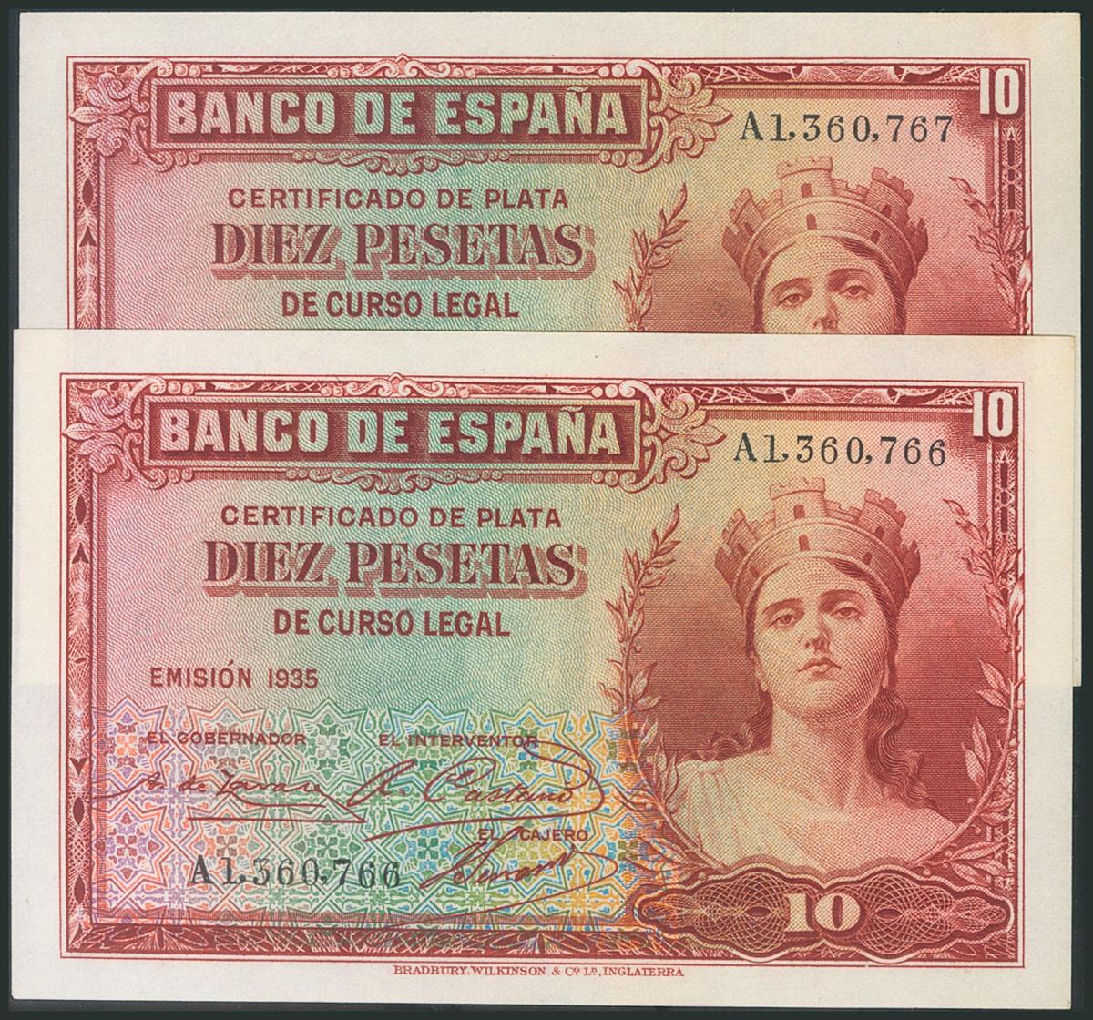 10 Pesetas. 1935. Pareja correlativa. Serie A. (Edifil 2017: 364a). Manchitas de óxido. SC.