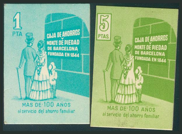 BARCELONA (1980ca). Conjunto de vales de 1 Peseta y de 5 Pesetas del Ahorro Escolar de Monte de Piedad de Barcelona. EBC+.