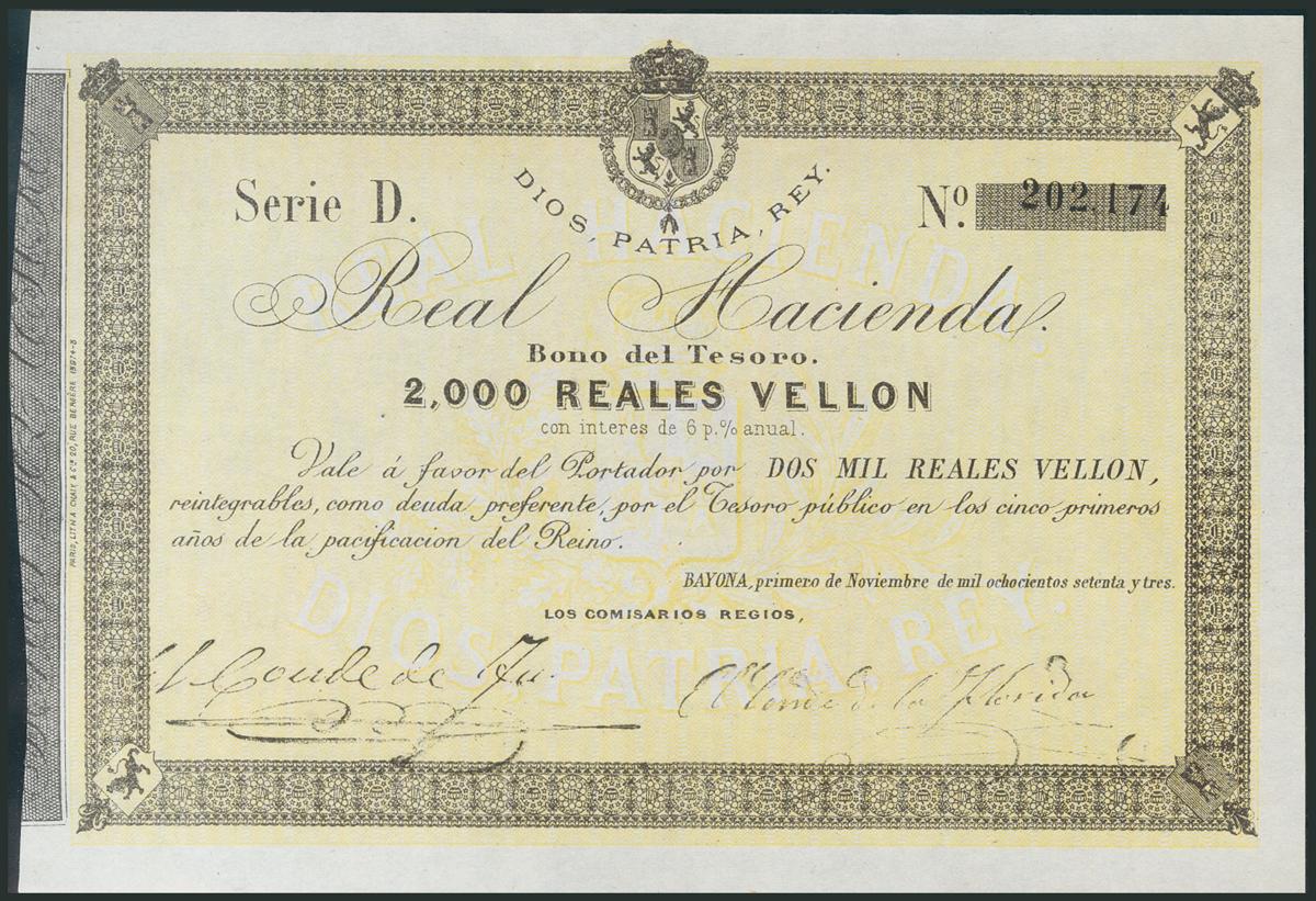 2000 Reales. 1 de Noviembre de 1873. Serie D. (Edifil 2017: 213). SC-.