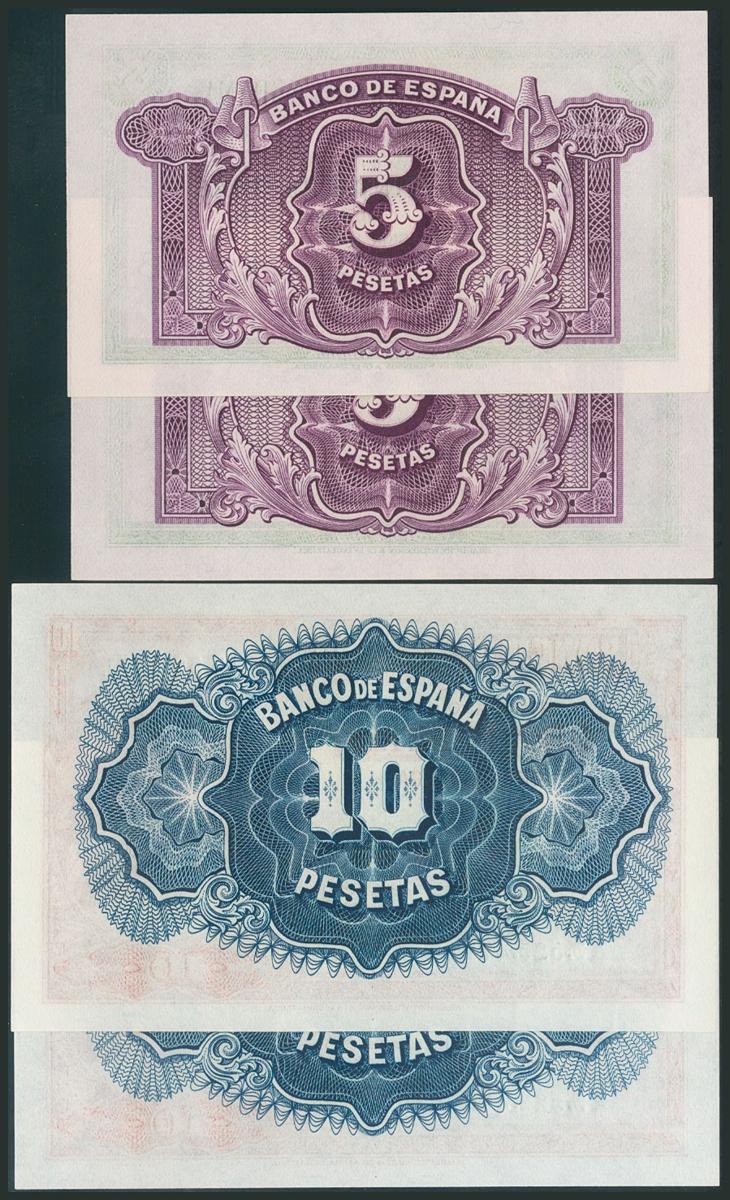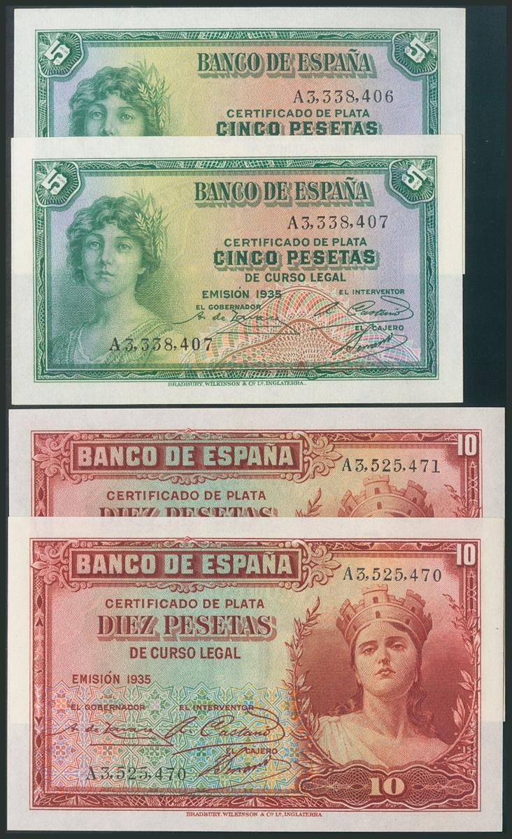 5 Pesetas y 10 Pesetas. 1935. Parejas correlativas. Serie A, ambas. (Edifil 2017: 363a/364a). Conserva todo su apresto original. SC.