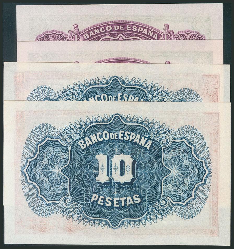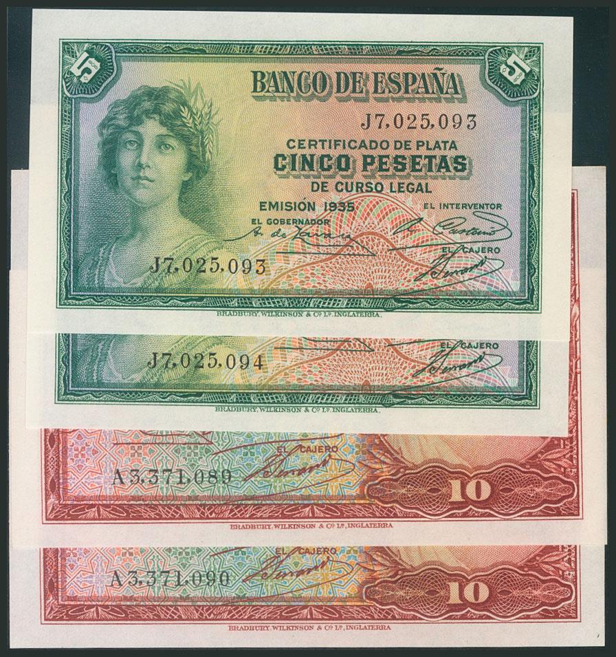 Conjunto de 2 parejas correlativas de 5 Pesetas y 10 Pesetas emitidas en 1935 y con las series J y A, respectivamente (Edifil 2017: 363b y 364a). Apresto original. SC-.
