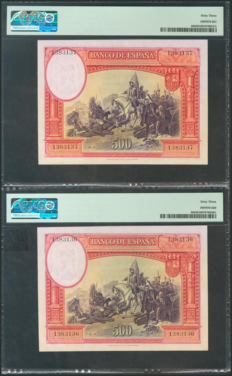 500 Pesetas. 7 de Enero de 1935. Pareja correlativa. Sin serie. (Edifil 2017: 365). SC. Encapsulado PMG63, ambos.