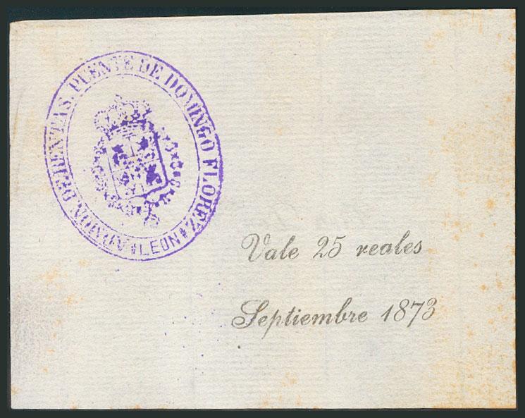 25 Reales. Septiembre de 1873. Vale de la Administración de Rentas de Puente de Domingo Flórez (León). (Edifil 2017: Página 26). Muy raro. EBC.