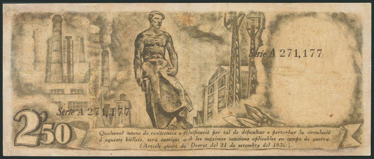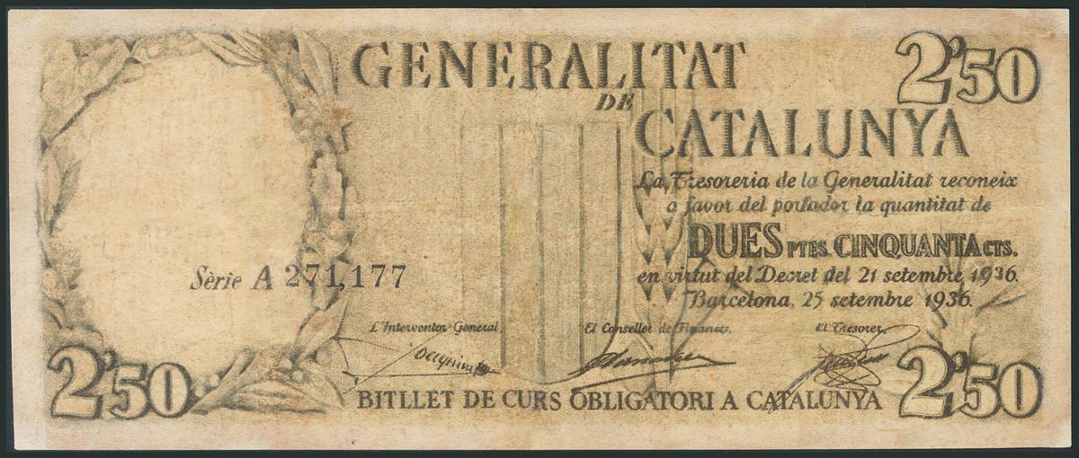 2´50 Pesetas. 25 de Septiembre de 1936. Serie A. (Edifil 2017: 372). Expertamente y profusamente reparado en el pliegue central y horizontal (además de las esquinas), dándole un aspecto espectacular y muy superior a la conservación real, con un apresto muy plano y con falta de viveza. RC, en su estado original.