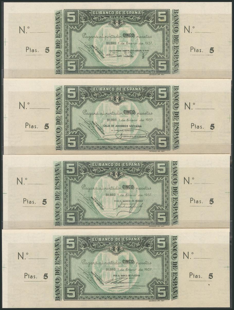 Conjunto de 4 billetes de 5 Pesetas emitidos por el Banco de España en la sucursal de Bilbao el 1 de Enero de 1937, incluyendo las 4 antefirmas conocidas, sin serie y sin numeración, con ambas matrices (Edifil 2017: 385a/f). Inusual conjunto. SC.